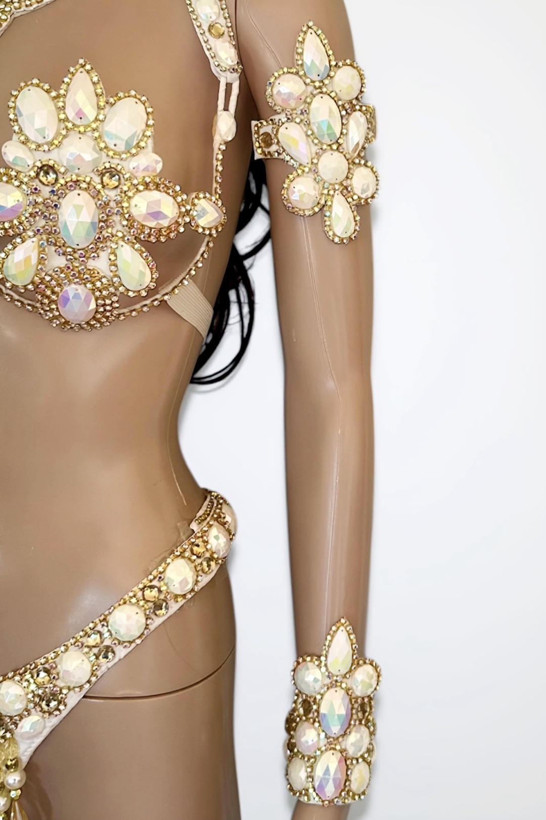 Radiante is a luminous samba costume, crafted with dazzling AB stones that reflect a spectrum of light. Elegance in motion. Handmade by Miss Glamurosa Costumes.